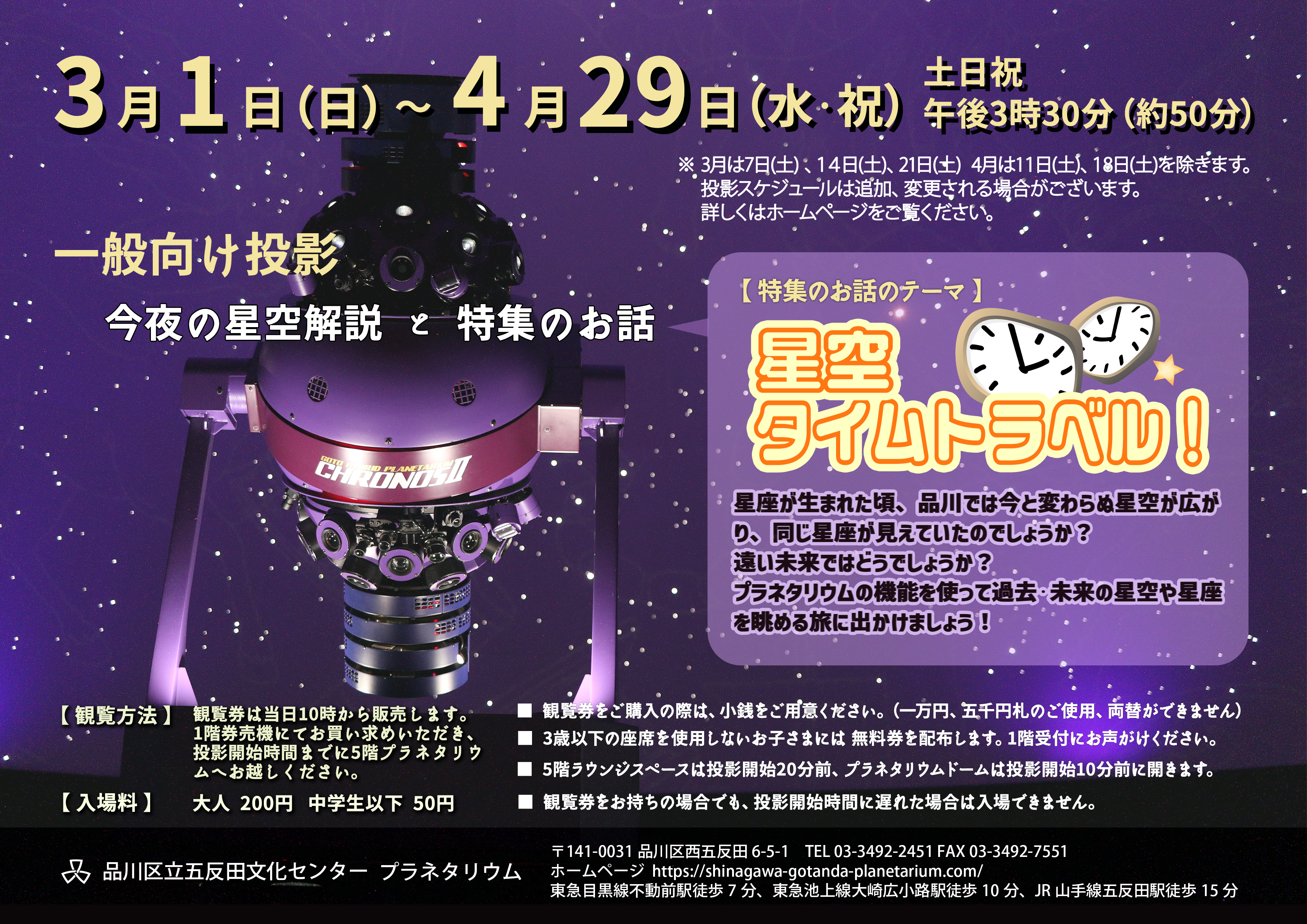 3月21日(土)、4月18日(土)は特別投影のため、一般向け(特集のお話)投影はありません。