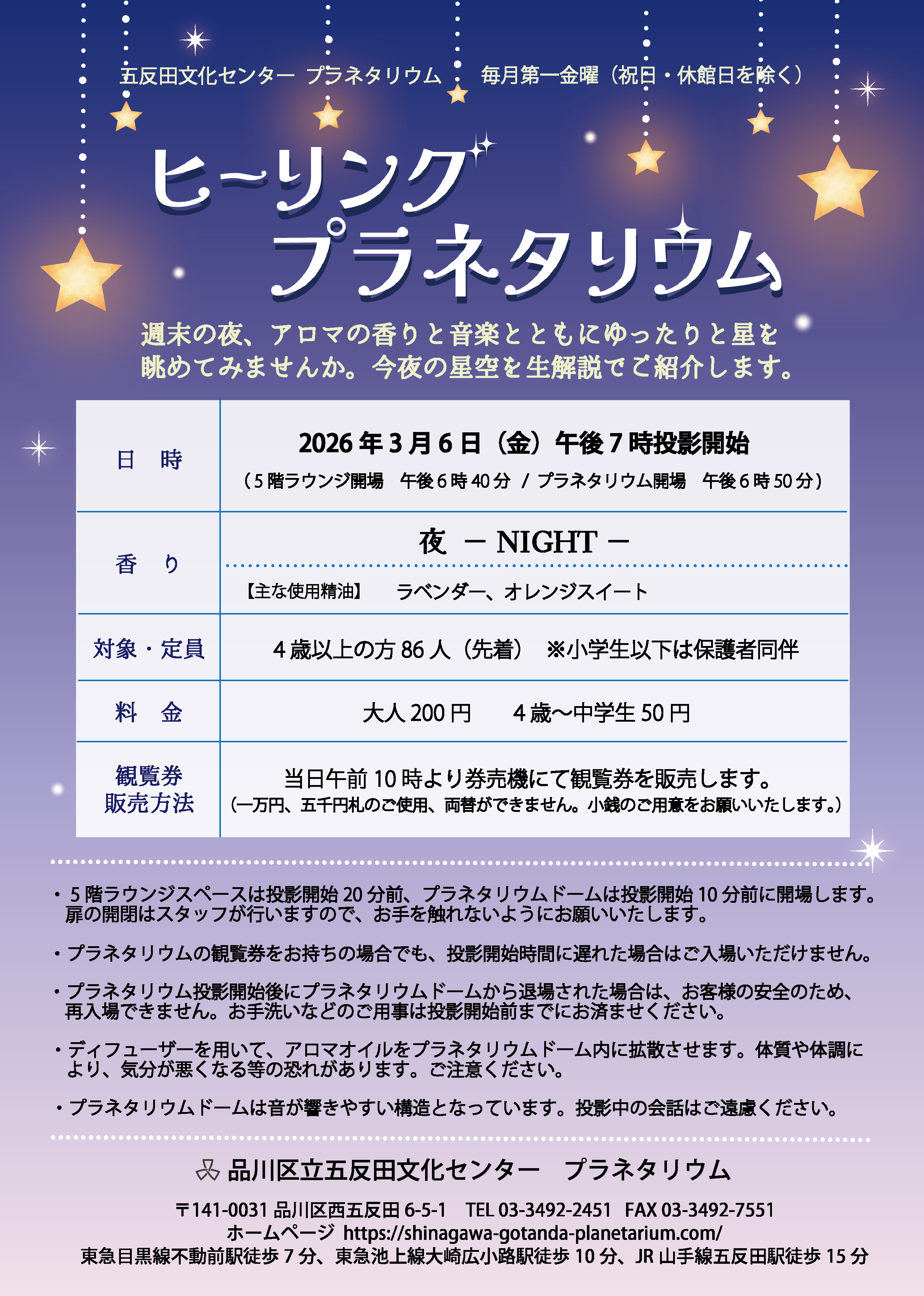 ※5階ラウンジ開場時刻は午後6時40分、プラネタリウム開場時刻は午後6時50分です。